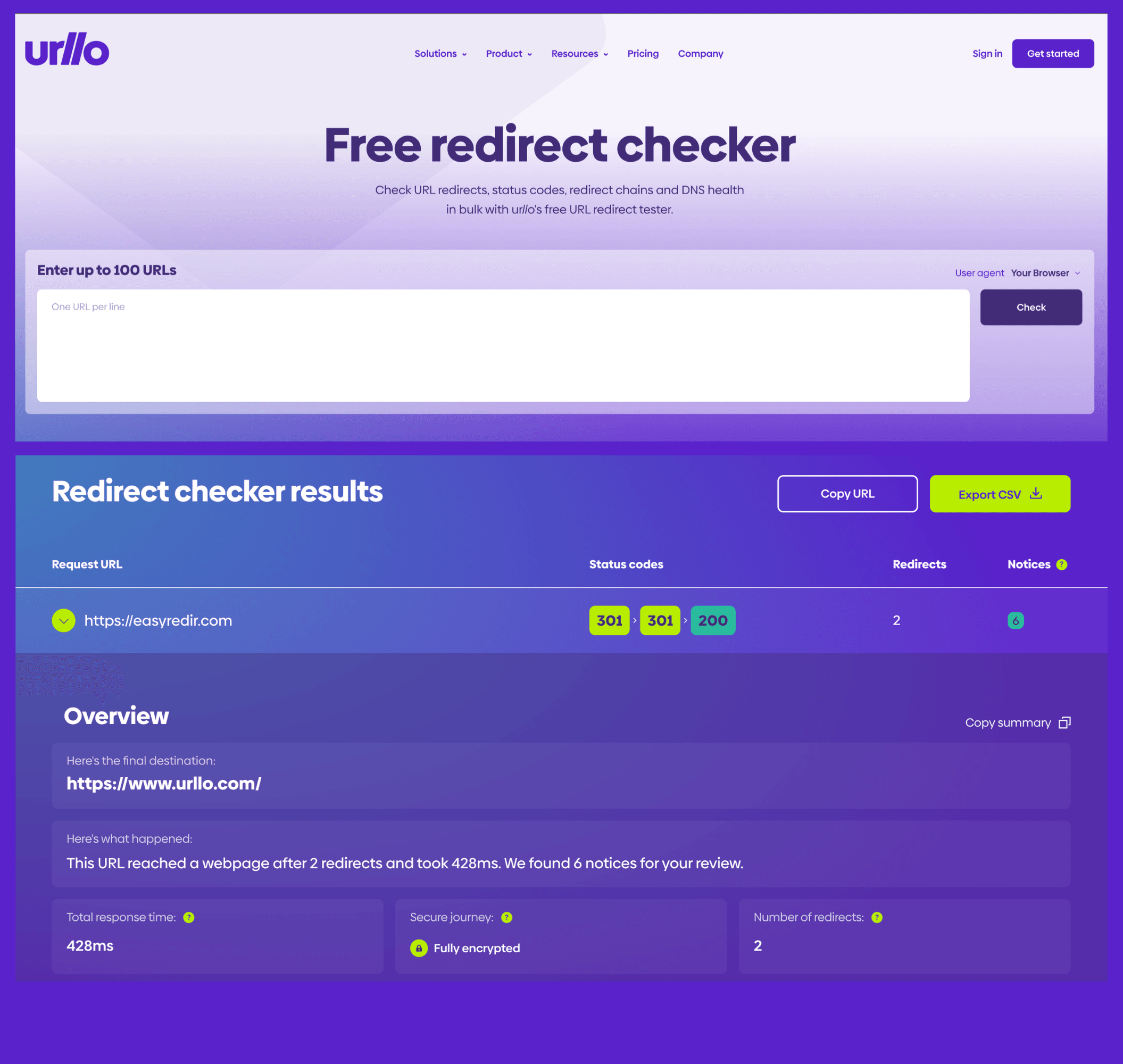 Check URL redirects, status codes, redirect chains and DNS health in bulk.