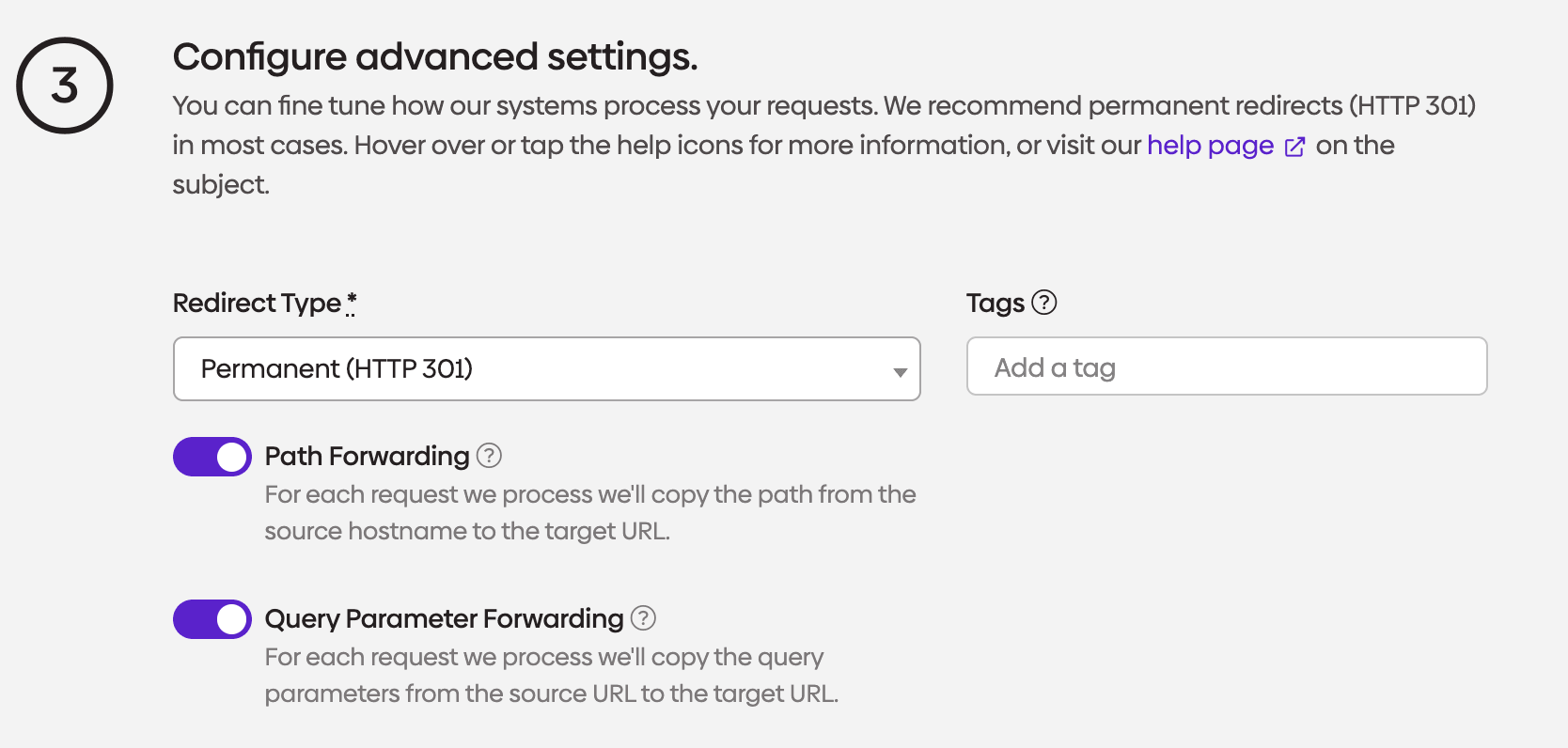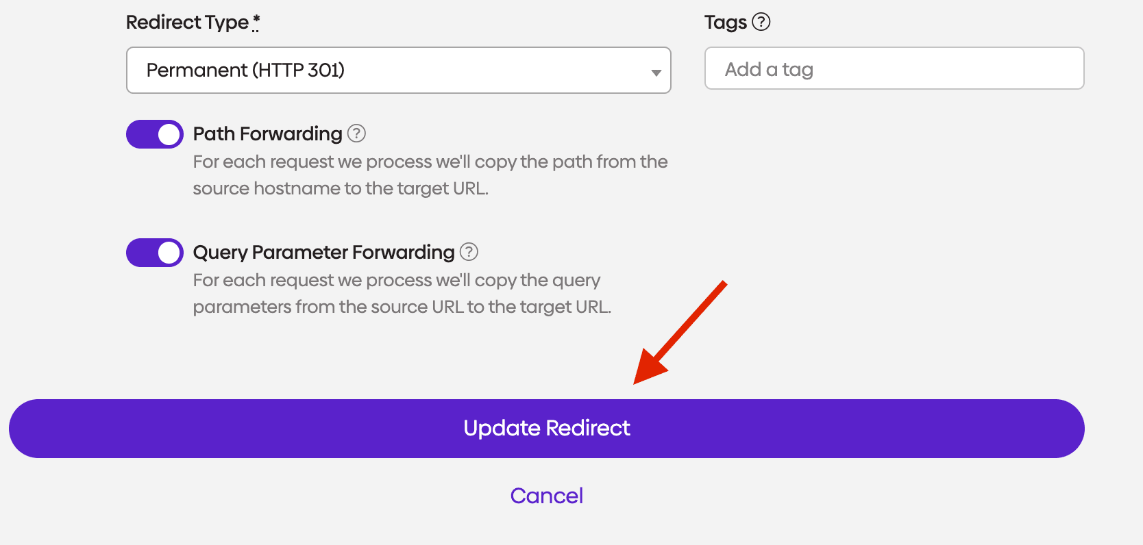 Next, set the "Redirect Type" to "Permanent (HTTP 301)" and make sure both "Path Forwarding" and "Query Parameter Forwarding" are enabled.