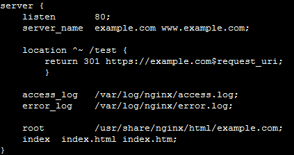 This configuration listens on port 80 (HTTP) and issues 301 redirects to the HTTPS version using the same domain name and request path. The `$server_name` and `$request_uri` variables ensure that redirects preserve the original URL structure.