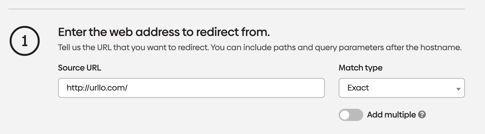 In the "Source URL" field, enter your HTTP domain (e.g. http://yourdomain.com). Leave the "Match type" set to "Exact".